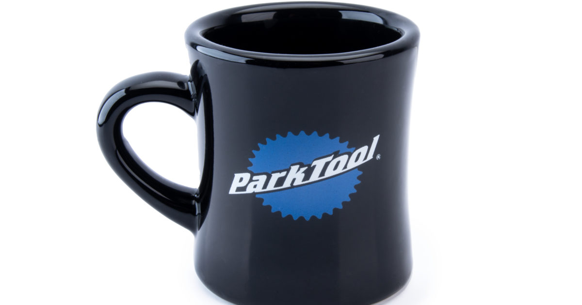 A black 10 oz. diner mug featuring the Park Tool logo on one side and "It's A Great Day To Fix A Bike!" on the reverse.