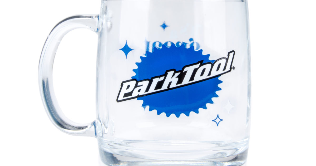 A clear glass 12.5 oz. mug featuring the Park Tool logo on one side and "It's A Great Day To Fix A Bike!" on the reverse.