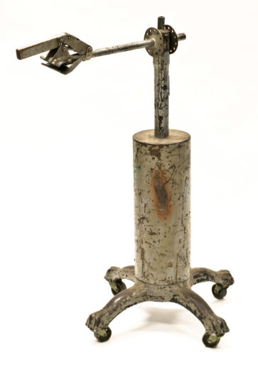 This is our original repair stand prototype. It was constructed from - amongst other things - a kitchen table, a truck axle, a bicycle hub, and a hockey stick.