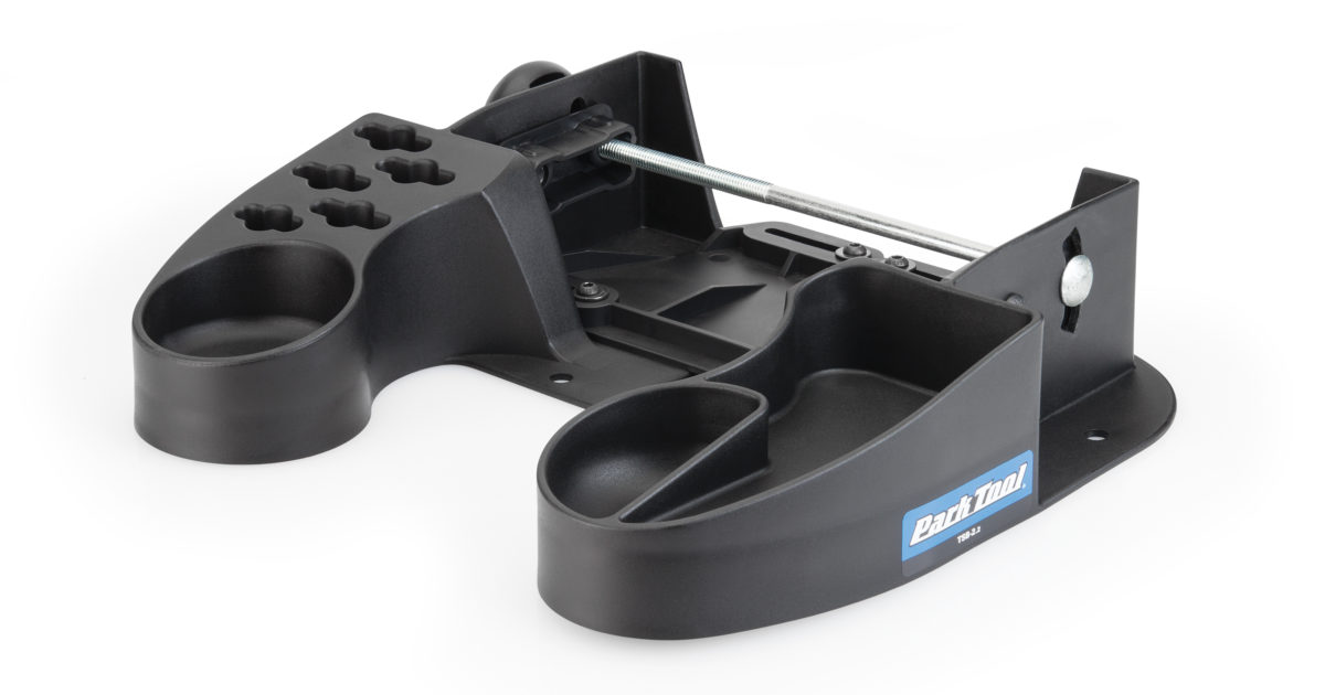 A sturdy adjustable base for Park Tool TS-2, TS-2.2, and TS-2.3 truing stands with extra compartments for tools and accessories.