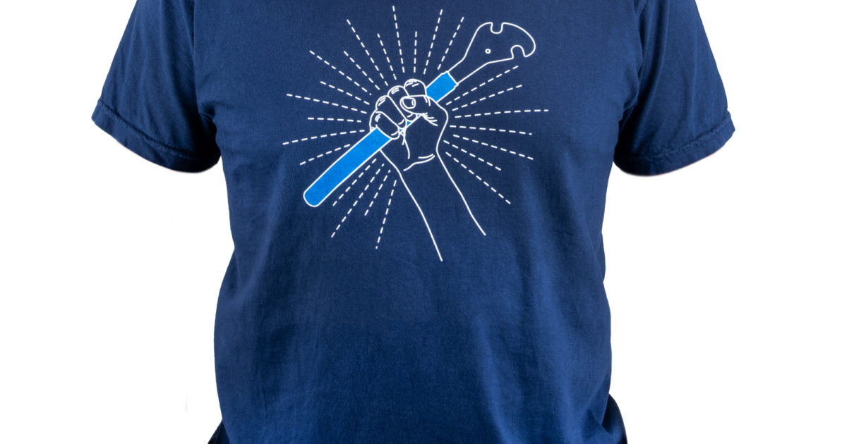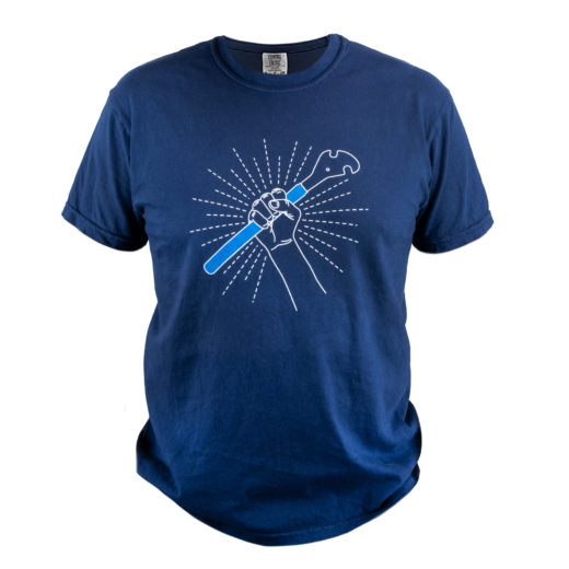 A relaxed-fit heavyweight navy blue tee featuring a large pedal wrench graphic
